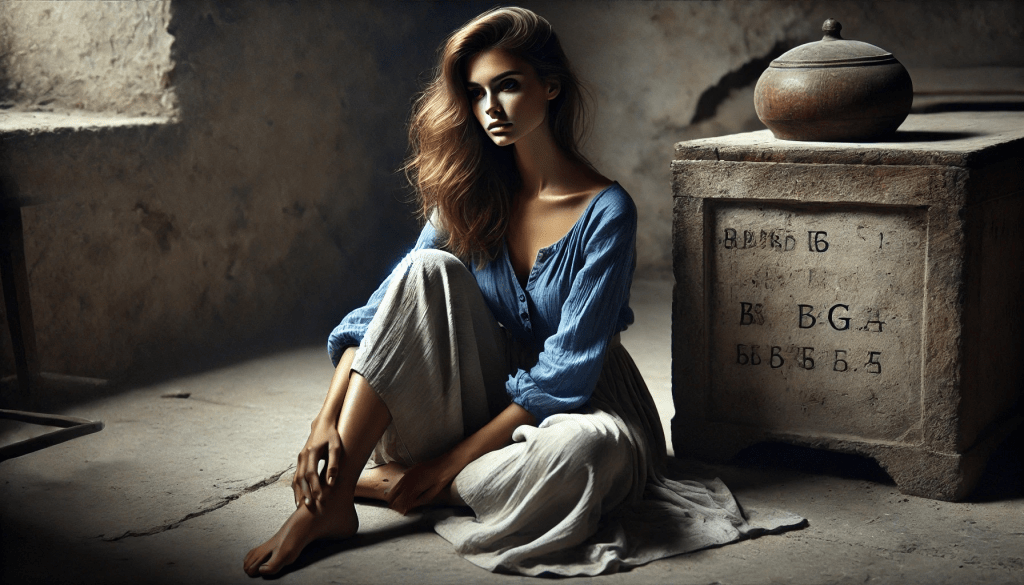A linda jovem, com seus cabelos longos e levemente ondulados, está sentada no chão, sua figura quase etérea no ambiente silencioso. Ela usa uma blusa azul, simples, mas que parece capturar a essência da calmaria que a envolve, e suas calças de tecido leve fluem suavemente ao redor de suas pernas, como se a própria brisa tivesse se misturado à sua roupa. Seu olhar está perdido no vazio, mas sua mente parece viajar por um caminho distinto, como se ela estivesse distante do presente, navegando pelas águas turvas das memórias.