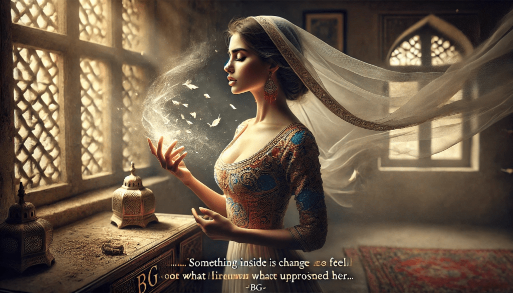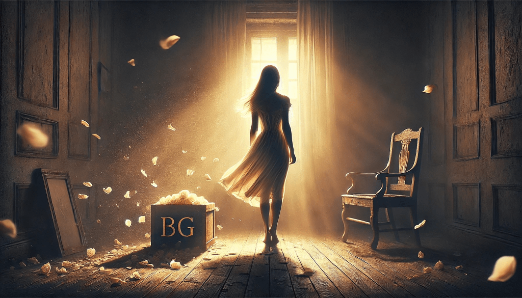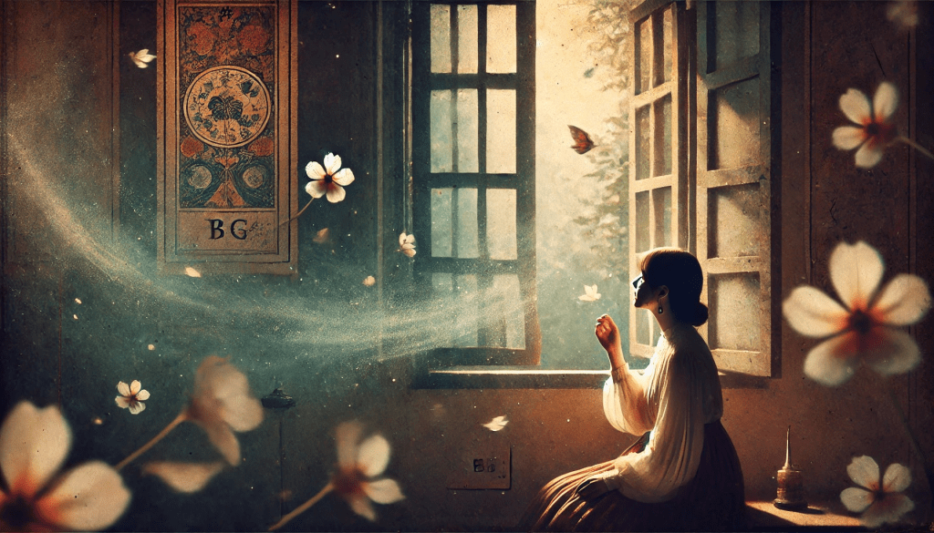 Ela não se move imediatamente, como se precisasse absorver cada segundo daquele momento. Mas algo dentro dela começa a mudar. O vento, tão suave, mas cheio de uma força inusitada, toca-lhe a pele com a leveza de uma promessa não dita. A sala, com seus móveis envelhecidos e o ar carregado de histórias esquecidas, começa a se desvanecer à medida que ela sente o chamado do futuro, o convite para se libertar daquilo que a aprisionava.