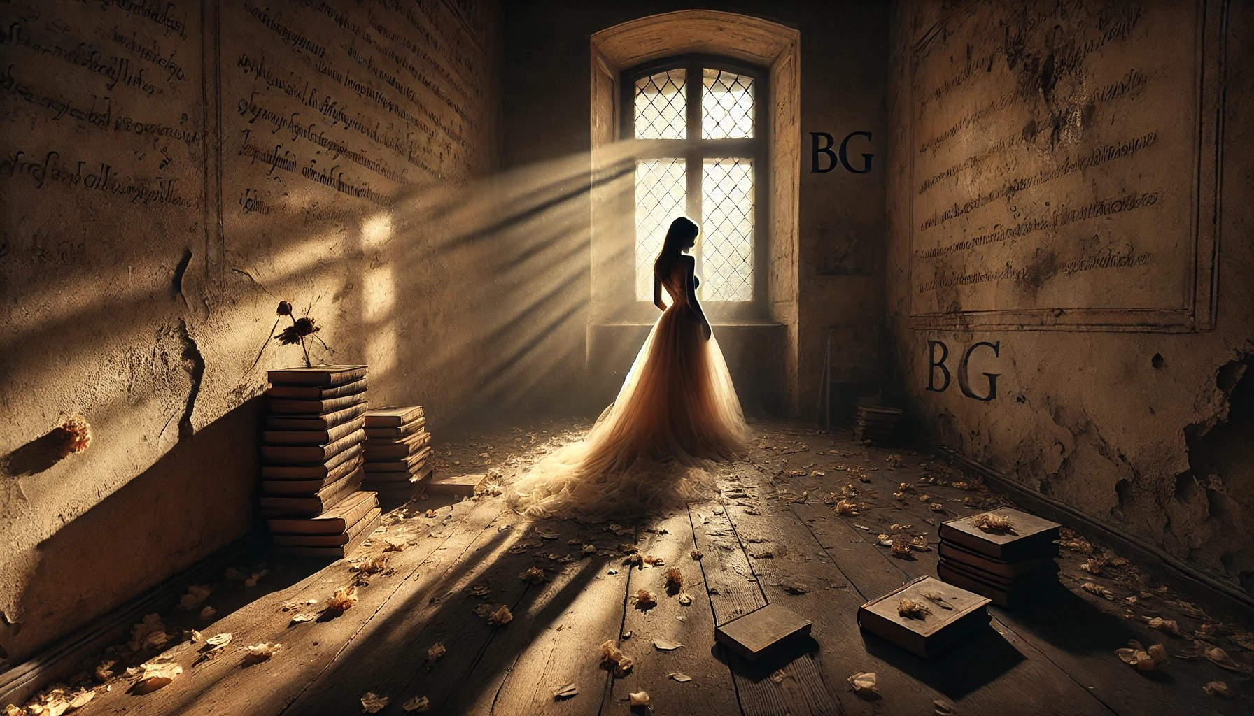 No silêncio que preenche a sala com uma suavidade quase palpável, a jovem se encontra sozinha, cercada apenas pelas sombras de um passado distante. A luz do entardecer, suave e dourada, penetra pela janela empoeirada, criando uma dança de sombras e brilhos sobre as paredes desgastadas. O ar parece carregar a leveza de um segredo não dito, e o chão, coberto por pétalas desfeitas, reflete a fragilidade de um momento que se perde no tempo, mas que, ao mesmo tempo, parece eterno. Cada pétala caída é um eco de algo que foi belo e agora se desfaz, um resquício de um amor que se extinguiu como as flores no fim da estação.