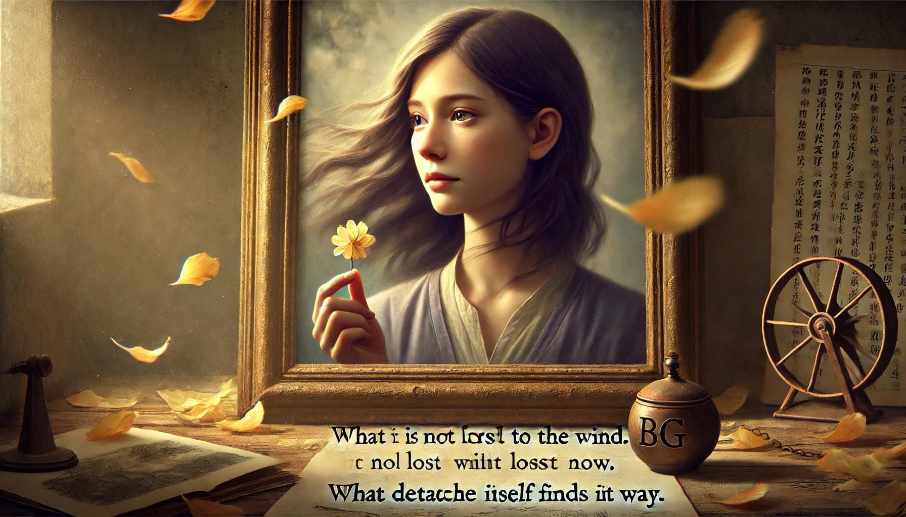 A jovem, então, olha para o retrato uma última vez, como se se despedisse não de um objeto, mas de um pedaço de sua própria história. Ela não precisa mais dele. O vento a guiaria agora. As pétalas, que um dia foram flores vibrantes, agora são apenas fragmentos de algo que se foi. Mas, ainda assim, elas têm algo a lhe dizer: que o que se perde ao vento, não se perde completamente. O que se desprende, encontra seu caminho.