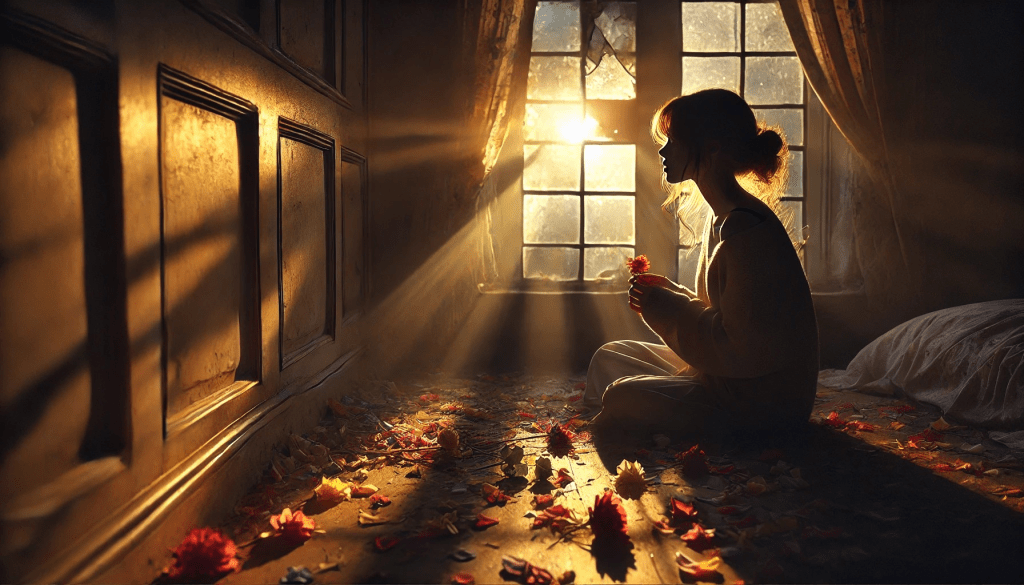 A luz da manhã se infiltra pela janela quebrada, agora com mais força, desafiando o que restava da noite e das sombras que se prolongavam nas esquinas da sala. O sol, com sua aurora tímida, toca o chão onde as pétalas, em sua quietude, parecem se aquecer na presença da luz, como se a promessa do novo dia fosse capaz de restaurar o que foi perdido. Mas, para a jovem, o calor do sol não trazia mais a mesma sensação de consolo. Ela se mantinha ali, no meio das pétalas espalhadas, com os olhos distantes, fixos em algo que já não estava mais presente, mas que, de alguma forma, ainda aprisionava.
