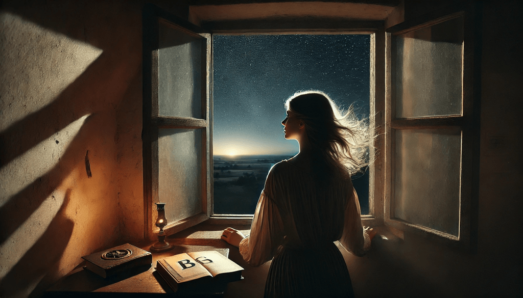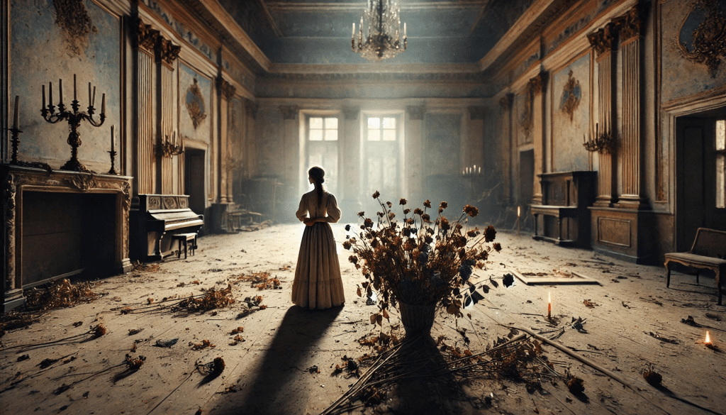 A jovem, com os olhos ainda voltados para o horizonte, sente uma mudança dentro de si. O medo, embora presente, já não é tão forte. O vento, agora um companheiro constante, a guia para a porta, para o além da sala, para o além das pétalas que caem. Ela sabe que as lembranças não se apagam, mas se transformam. E, ao dar o primeiro passo em direção ao mundo exterior, ela se dá conta de que, ao contrário do que pensava, as pétalas não se perdem no vento; elas seguem em direção a algo novo, algo que está por vir.