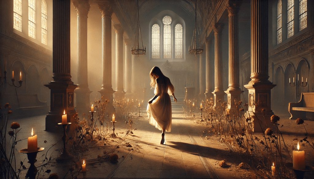 Ela se levanta lentamente, seus passos suaves, como se não quisesse perturbar a serenidade do ambiente. Mas o ar, carregado com o perfume das flores que já se foram, parece insistir para que ela siga em frente. O salão nobre atrás dela, agora envolto em uma luz suave, parece mais uma relíquia do que um objeto de adoração. As luzes, que antes ardiam com fervor, estão agora apagadas, suas chamas extintas pela passagem do tempo. As flores secas, antes um símbolo de devoção, estão desfeitas, murchas, como a juventude que também se esvai com a passagem dos anos. Não há mais promessas a cumprir ali, apenas vestígios de um amor que se foi, de uma fé que não conseguiu se sustentar.