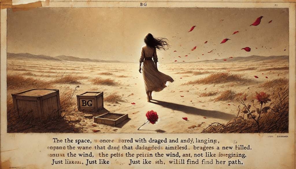 O vento, com sua força constante, parece empurrá-la para fora, mas ela ainda se resiste. Cada pétala que cai é como uma memória que ela tem medo de soltar, cada um desses pequenos fragmentos de flor é uma parte de si mesma que ela teme perder. Mas, à medida que observa as pétalas flutuando para longe, ela entende que a vida não é feita de permanências. O que é belo, como a flor, precisa murchar para dar espaço ao novo. O que é efêmero não é menos precioso; ao contrário, é a sua fragilidade que lhe confere valor.