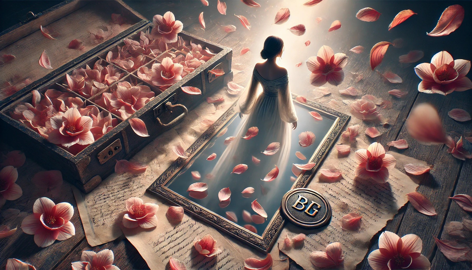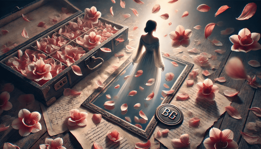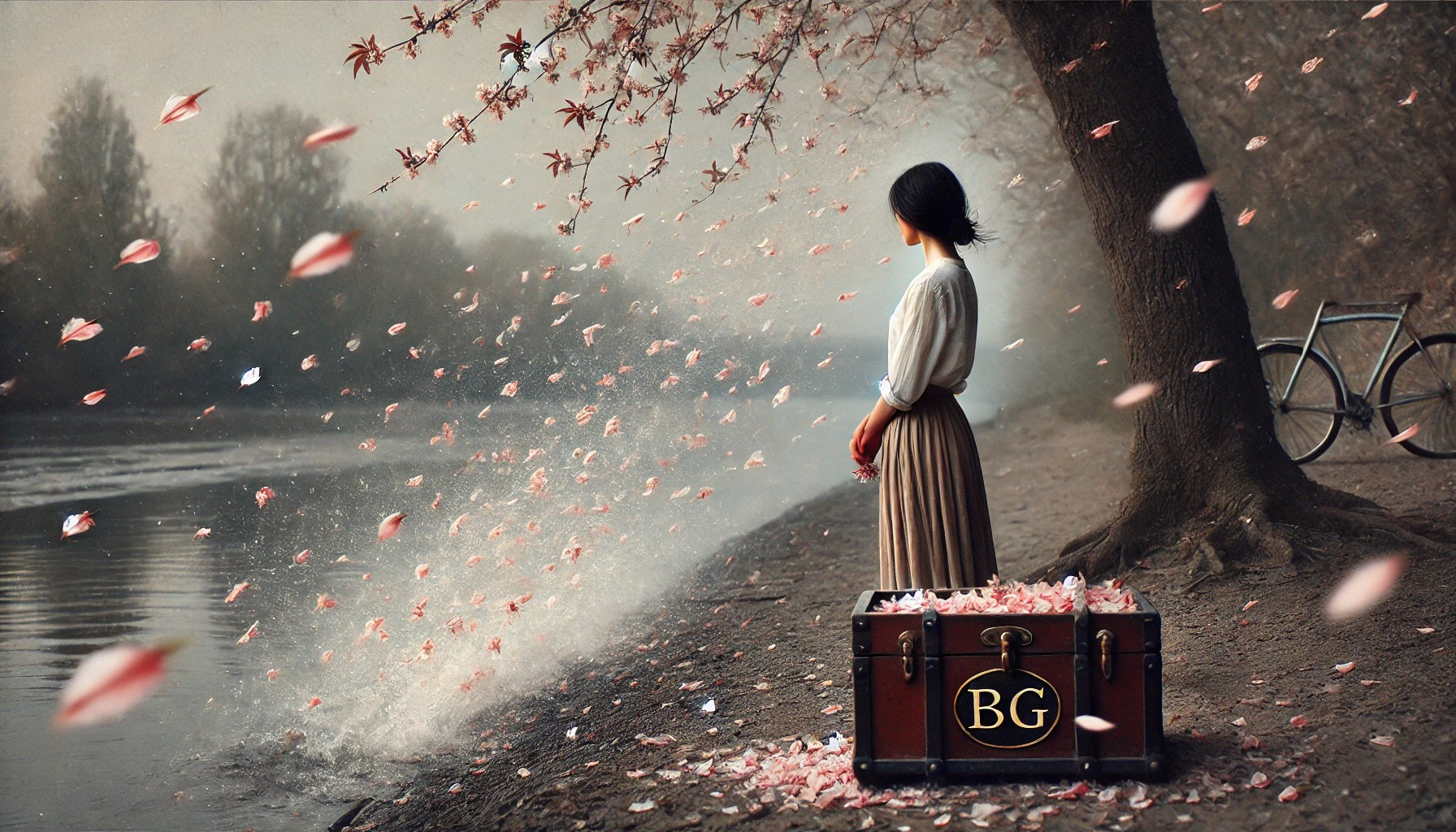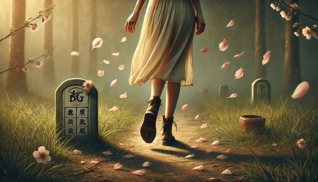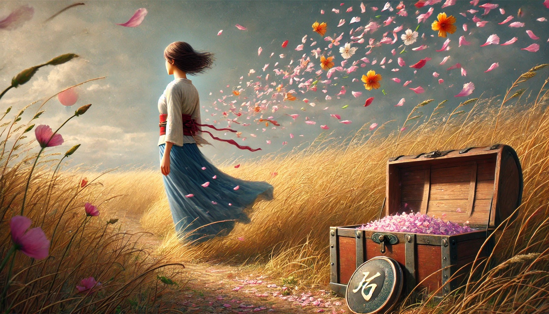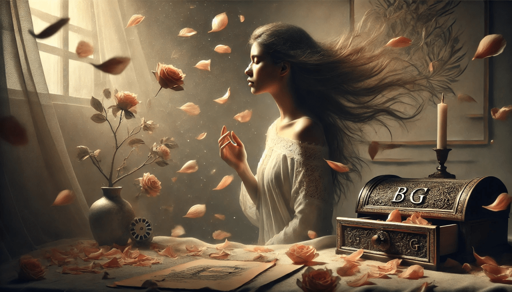 As pétalas que caíram ao chão, agora transformadas em fragmentos de uma história que ela já não precisa mais carregar, são como o reflexo de algo que se foi. Não são mais símbolos de perda, mas de transformação. Ela percebe que, assim como o vento leva as pétalas, ela também precisa deixar o que não mais serve para trás, para dar espaço ao que ainda está por vir. O passado, com todas as suas lembranças, já não a define. A jovem, com seu coração sereno, agora se sabe como um ser renovado, pronto para deixar o mundo se abrir à sua frente.