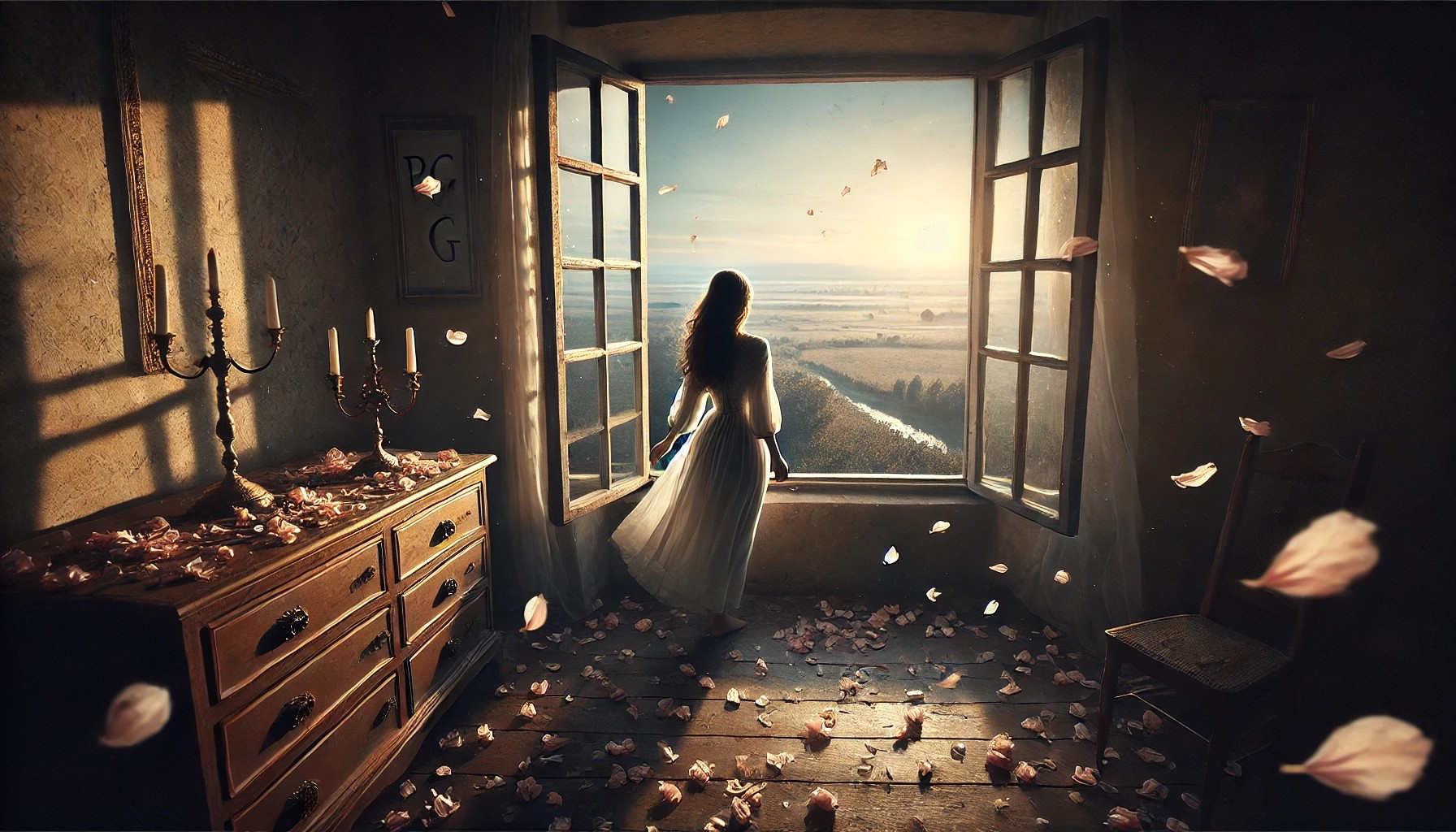 Ela caminhou sem pressa, os olhos fixos no horizonte, onde o céu começava a se tingir de um tom mais quente, como se o próprio dia começasse a despertar para o novo ciclo. Não havia mais vestígios daquelas paredes antigas, nem do salão nobre que, em outros tempos, guardara seus desejos e lamentos. Agora, a jovem era como as pétalas ao vento – sem direção, sem amarras, mas com a certeza de que, ao ser levada pela brisa, algo belo e profundo nasceria dessa jornada. O vento, sempre presente, parecia agora ser o guia de sua alma, conduzindo-a sem pressa, sem julgamento, apenas com a serenidade do momento que se desdobrava.