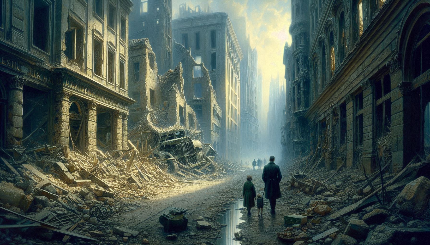 À medida que o último eco das batalhas se dissipa no ar, um silêncio profundo toma conta do mundo. O estrondo das armas, o clamor da dor, as chamas que destruíam tudo à sua volta, finalmente se apagam, deixando para trás uma terra em ruínas. Porém, no seio da destruição, começa a surgir algo inesperado: a promessa de um novo começo. O mundo, que parecia ter sido consumido pela escuridão, encontra na quietude o terreno fértil para seu renascimento. A vida, em sua essência mais pura, começa a brotar das cinzas da guerra, como uma semente plantada em solo fértil que, apesar das dificuldades, se esforça para alcançar a luz.